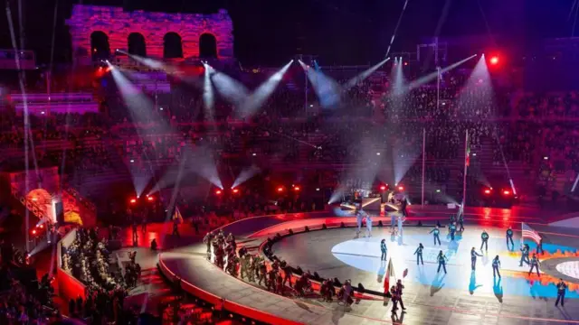 ヴェローナでは競技は開かれないが、2000年の歴史をもち、ユネスコ世界遺産に登録されている円形闘技場が、開会式の会場となった。2月にあったミラノ・コルティナ・オリンピックの閉会式も同じ場所で催された。
