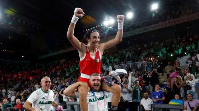 判定が確認されると、楊はケリフの腕をとって高く掲げた。続いてアルジェリア・チームのコーチたちに肩車されたケリフは、アルジェリア国旗を揺らす会場の称賛に応えた。
