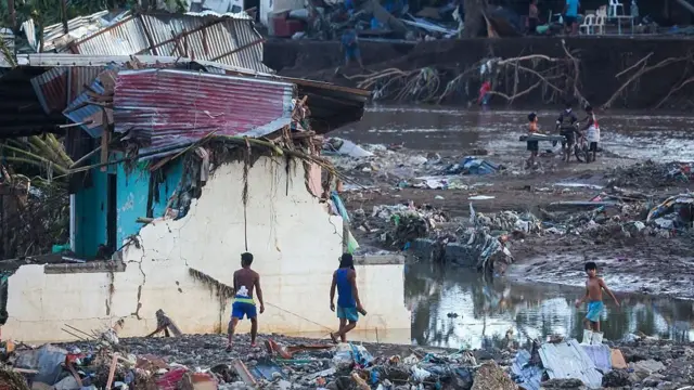 セブ島では住宅地で甚大な被害が出ている。小さな建物が多数流され、洪水が引いた後は厚い泥が残されている。救助隊はボートを使い、家の中に閉じ込められた人を救出している。
