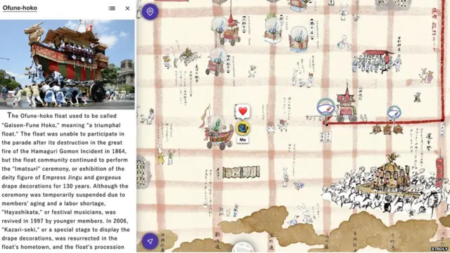 Stroly(ストローリー、本社・京都市)が提供するオンライン地図が、京都市内を2日に分けて巡行する34基の大船鉾(おおふねほこ)の場所を表示。ユーザーはGPSで自分の場所がわかるだけでなく、地図上の地点をクリックすれば、歴史的背景やライブイベントなどの最新情報を知ることができる。地図上で友達と会い、チャットすることも可能だ。