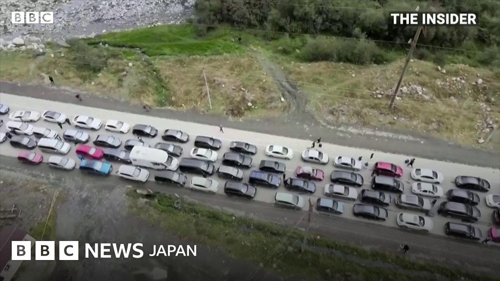 ロシアのジョージア国境では26日、出国のために手続きを待つ車両の長い列がドローンによって撮影された。