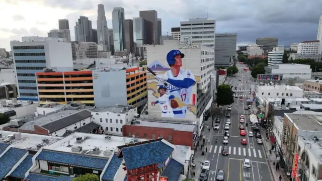 이 유서 깊은 동네에는 LA 다저스의 스타 선수 오타니 쇼헤이의 45m 높이 벽화가 그려져 있다. 팬들이 입은 유니폼에는 그의 이름이 새겨져 있다.