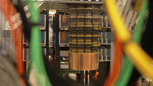 대신 기름통 크기의 둥근 원반형 장비 수십 개가 검은 제어선에 연결돼 있었다. 제어선은 액체 헬륨 냉각 장치로 이어졌다. 이 장치는 양자 마이크로칩을 절대 0도보다 1000분의 1도 높은 온도로 유지해준다.