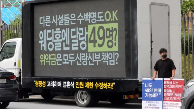 전광판에는 "웨딩홀 면적과 여건 고려 없이 무조건 49인?" "형평성 고려해 결혼식 인원 제한 수정하라" 등의 문구가 적혀있었다.