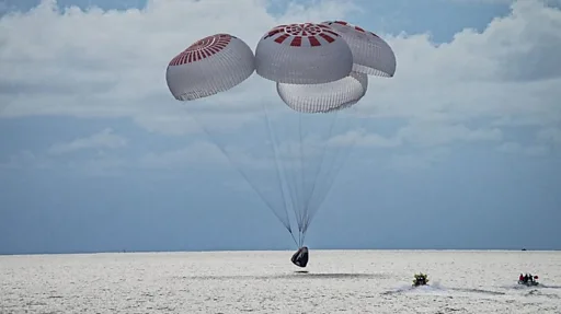 탑승객이 탄 캡슐은 바다에 내리면서 낙하산 4대를 펼쳐 하강 속도를 줄였다. 스페이스X 보트는 캡슐 회수를 위해 착수 지점까지 속도를 냈다.