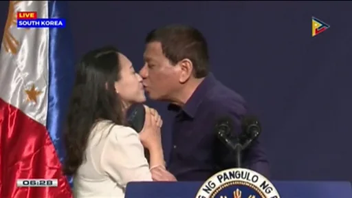 문재인 대통령과 정상회담을 위해 방한 중인 로드리고 두테르테 필리핀 대통령이 공개석상에서 한 여성의 입술에 키스해 물의를 빚고 있다.