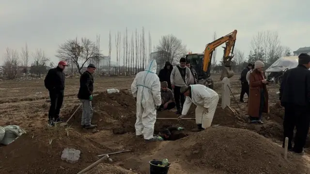 "Маалыматты WhatsApp'тан уктук. Анан бүгүн күрөктөрүбүздү көтөрүп келип, өзүбүз казып, бул жакка коюп жатабыз. Үч адамды бир жайга коюп жатабыз. Чоң атамдын атасынын ордуна чоң атамды койдук эле. Эки адамды бир жайга койгон элек. Жанына апамды койдук эле. Ошол үчөөнү алып келип, бул жерге коюп жатабыз", — дейт тургундардын бири.