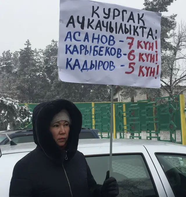 Алды жети күндөн бери ачкачылык кармап жаткан абактагы саясатчылар Кубанычбек Кадыров, Бектур Асанов жана Эрнис Карыбековдун тарапташтары жана укук коргоочулар нааразылык акциясы уюштурушту.
