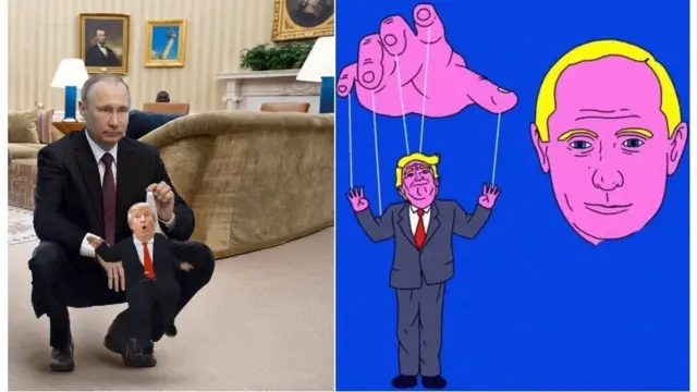 Мындай коллаждардын негизги темасы Путиндин Трампты кантип манипуляция кылып жатканы жөнүндө болду.