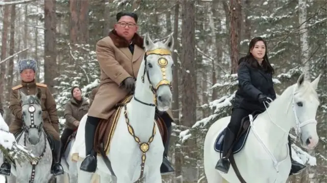 Түндүк Кореянын мамлекеттик маалымат агенттиги Ким Чен Ын жубайынын жана аскер башчыларынын коштоосунда ак боз аттарды минип, Пэктусан ыйык тоосун көздөй чаап баратышкан сүрөтүн жарыялашты.
