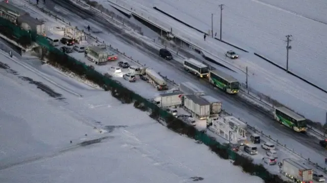 Жапонияда кар аралашкан катуу шамалдан 130 автоунаа кагылышып, бир киши каза тапты. Маалыматтарда он киши жаракат алганы айтылды. Окуя болгон жерде бир нече чакырымга созулган тыгын пайда болгон.