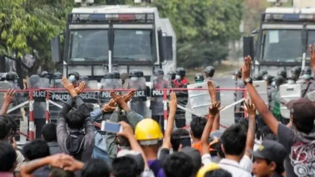Ишембиде каршылык жүрүштөрү өлкөнүн бир нече аймагында өттү. Алар камакка алынган өлкө лидери Аун Сан Су Чжини бошотууну талап кылууда. Айрым митингчилер полицияга таш ыргытканда, алар көз ачыштырган газ, ок атуучу курал менен жооп кылды. Полиция согуштук ок колдонгону белгилүү болду. Демонстранттардын бири башына, экинчиси көкүрөгүнө ок жеп каза тапкан деп кабарлады ыктыярчы дарыгерлер. Полиция эч кандай маалымат бере элек.
