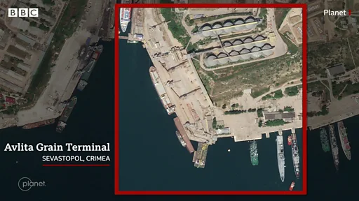 Севастополдогу "Авлита" дан терминалынан тартылган спутник сүрөттөргө караганда, июндун ичинде активдүүлүк жогору болгонун, ошол эле убакта сары материал кемелерге жүктөлгөн дандын түсүнө туура келерин көрсөтөт.