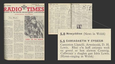 The first edition of the Welsh language hymn singing radio series Caniadaeth Y Cysegr was aired across the UK on the BBC Home Service on February 15, 1942.