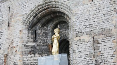 Pictured: 20-foot tall statue of Dame Shirley Bassey, standing on the walls of Caernarfon Castle in the pose of Boadicea