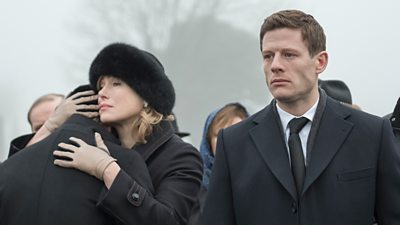 The image shows James Norton (War & Peace, Happy Valley) playing Alex Godman and Maria Shukshina playing his mother Oksana, at a family funeral. When his family’s past murderously returns to threaten them, Alex is forced to confront his values to protect those he loves.