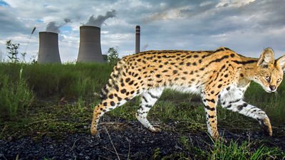 Equipped with a surveillance night vision camera and thermal scopes, the team spent several weeks filming inside the secure buffer zone that surrounds Africa's biggest industrial complex. It is home to zebra, wildebeest and ostrich. The lakes created to cool the machinery have led to an explosion of rodents - and with no big cats to worry about this wasteland has been overrun by the densest population of servals on the planet.