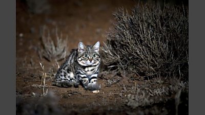 Africa’s deadliest cat is also the smallest. She waits for nightfall before heading out to hunt. Using specialist night cameras that rivals a cat’s own vision, the team joined researchers in South Africa's Karoo desert to track an individual that they have named Gyra.