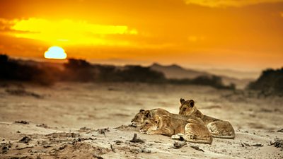 The cubs were orphaned before their mother was able to teach them how to hunt. Fortunately, in the harsh desert, they have another way to survive. Here prey succumbs to hostile conditions, and a carcass lasts longer than it would on the plains. Lions are formidable hunters, but when times demand it they can survive by feeding on old rotting meat - unless danger comes and a bigger lion claims the meal.