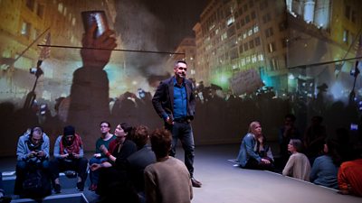 Why It’s Kicking Off Everywhere is directed by David Lan and performed by Paul Mason, Khalid Abdalla, Sirine Saba and Lara Sawalha. It is directed for TV by Tim van Someren and produced by the Young Vic in partnership with Totally Theatre Productions.