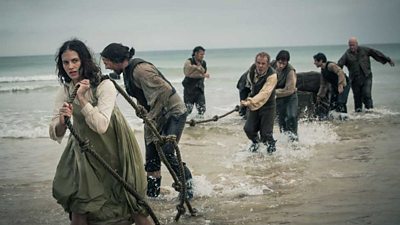 I wanted to film the wrecking sequence in the sea, and not in a tank in a studio. I wanted it to feel very raw and real. Going in the sea with all the crew and the actors was absolutely exhilarating, but completely gruelling as well. I’m not a very brave person so I had grit my teeth. We had to wear dry suits, and have our ankles weighted so we didn’t get flipped off our feet by the waves. We each had a lifeguard in the water to fish us out when we fell over! The crew kept me going, but unlike me, they’re all really brave and loved it!