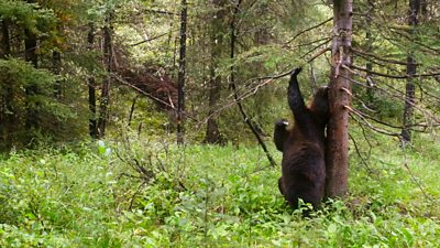 The team used remote camera traps concealed in rubbing trees to reveal the secret world of grizzly bears and their use of the trees like crazy pole dancers!