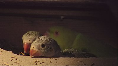 - Ring-necked parakeets (pictured above). Nesting in the attic of a pub in Kent, these small but feisty parrots are more than a match for the boisterous antics that go on below. Starting off almost unrecognisably ugly, as the youngsters grow, their bright green plumage starts to come in, and as they start to wander around the roof space their ungainly habits are a joy to behold.