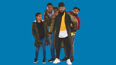Pictured: (L-R) Duaa Karim (Aks), Tolu Ogunmefun (Nate), Guz Khan (Mobeen), Tez Ilyas (Eight)