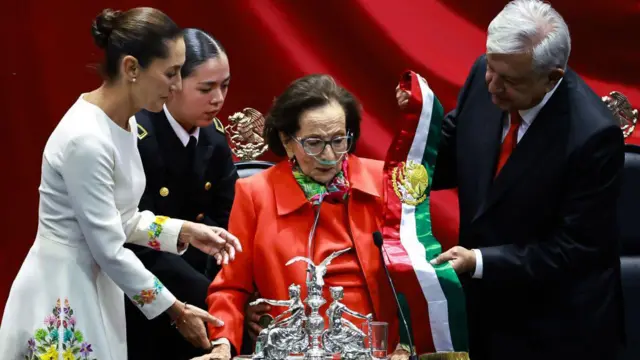 En la ceremonia en la sede del Congreso, Sheinbaum recibió la Banda Presidencial -la prenda que solo puede portar al presidente de México- de la mano de una figura histórica de la política mexicana: Ifigenia Martínez.