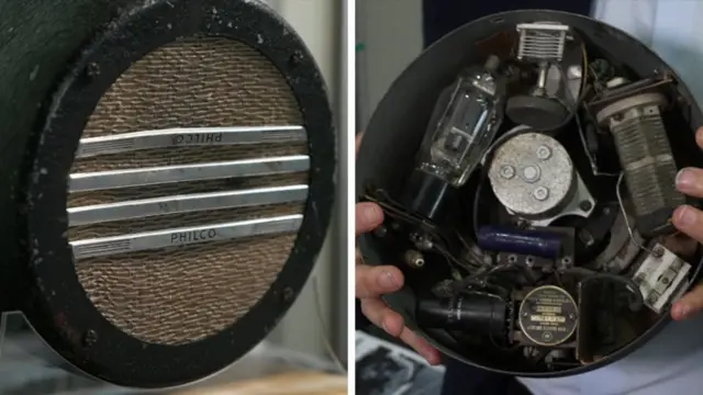 Es un altavoz de radio para coche que data de los años 1930. Escondido en la parte trasera hay un transmisor secreto.