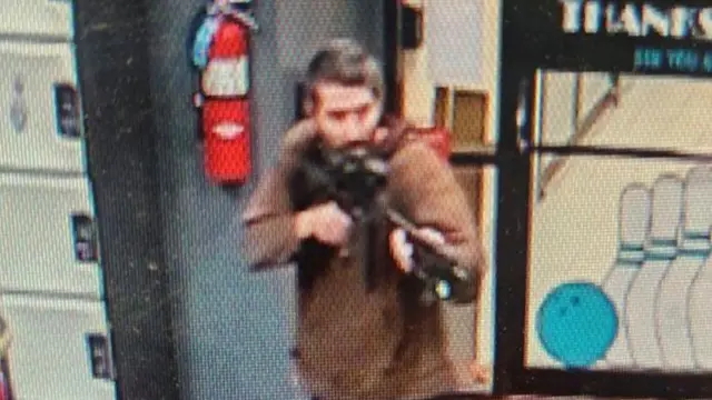 Las imágenes muestran a un hombre con barba vestido con un suéter entrando a un edificio con un rifle de asalto.