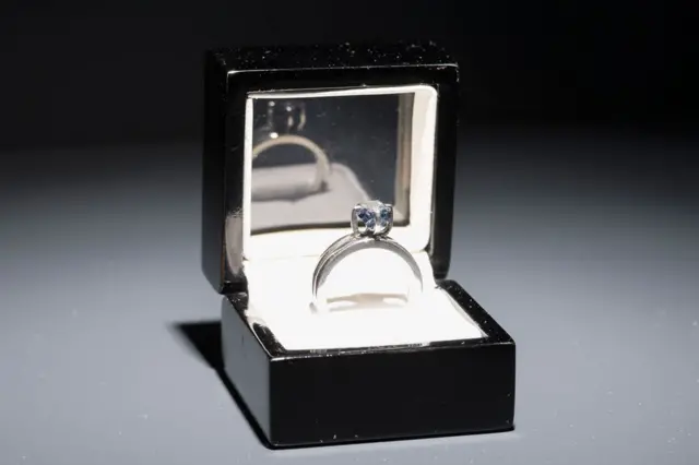 Está engarzado en un aro plateado, a modo del clásico anillo de compromiso de los anuncios de Tiffany's.