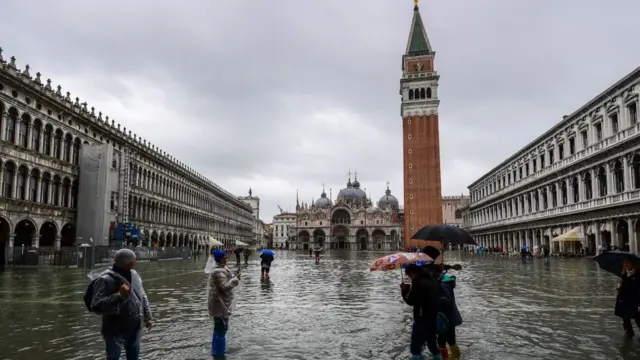Venecia experimenta regularmente el fenómeno de "acqua alta", mareas anormalmente altas que inundan tiendas y hoteles, así como la famosa Plaza de San Marcos.