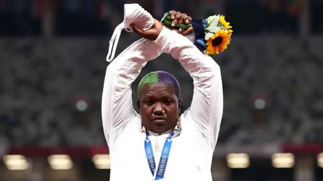 Al recibir la medalla de plata, y mientras las otras medallistas posaban para las fotos en el podio, la lanzadora de peso estadounidense Raven Saunders levantó los brazos en forma de "X".
