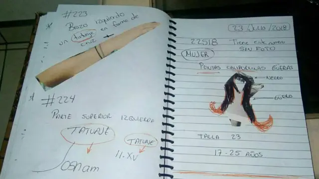 Se fijan en rasgos que pueden ayudar a identificarlos: tatuajes, lunares, la forma y desgaste de los dientes, su ropa, zapatos y los anotan en libretas escolares.