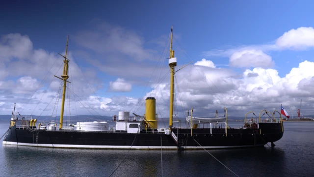 En la base naval de Talcahuano, 500 kilómetros al sur de Santiago de Chile, resta anclado un buque negro, amarillo y blanco, mucho más pequeño que los grandes y modernos navíos de guerra que se ven a sus espaldas.