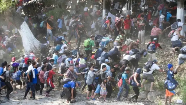 Este lunes, los migrantes habían estado acampando en la ciudad guatemalteca de Tecún Umán. Al otro lado de la frontera se encuentra Ciudad Hidalgo, en el estado mexicano de Chiapas.
