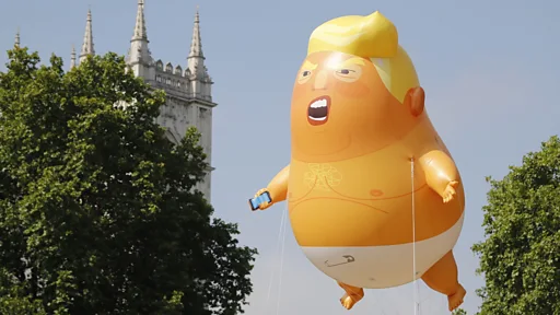 Se trata de un globo de helio de seis metros de alto que lo presenta como un bebé con pañal, cara naranja enfadada y manos pequeñas.