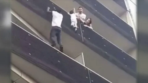 Todos miraban a un niño pequeño que colgaba del borde de un balcón del cuarto piso, de una sola mano, mientras que un vecino, al otro lado de la pared divisoria, trataba desesperadamente de alcanzarlo.