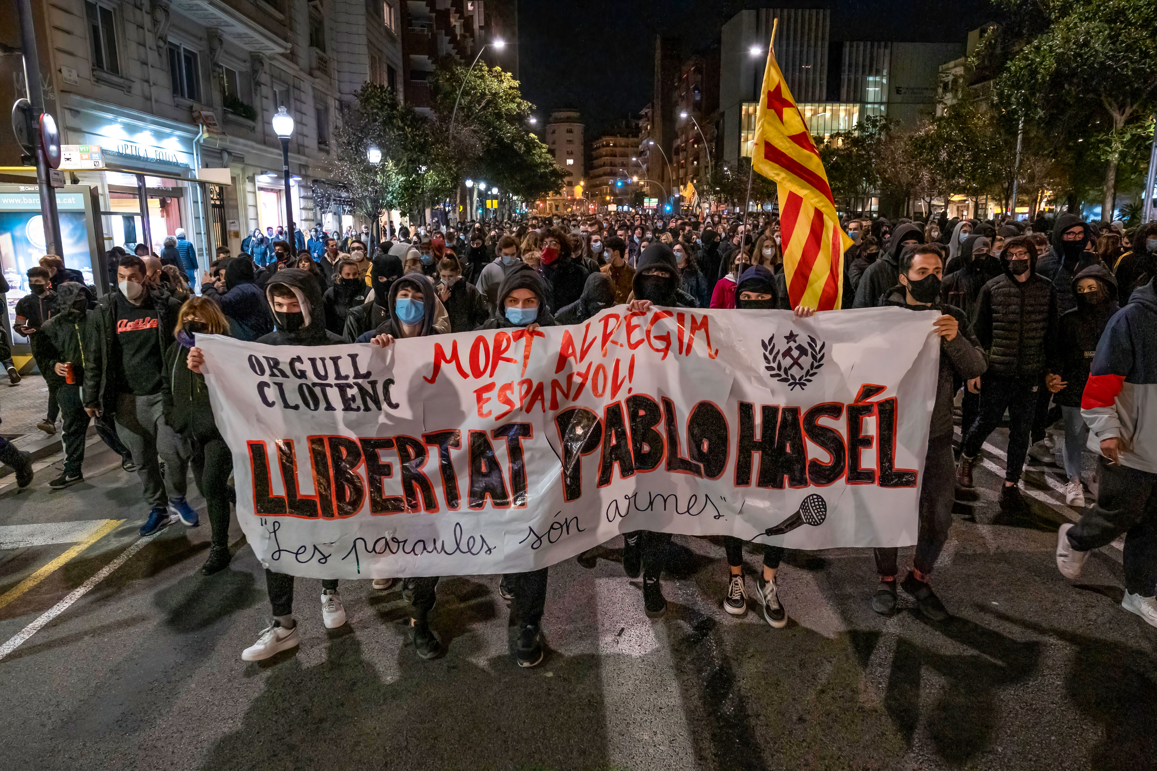 Los incidentes se produjeron después de que unas 4.000 personas se manifestasen pacíficamente en la capital catalana para pedir la libertad del rapero Hasél y para reivindicar otras demandas sociales como la regulación de los precios del alquiler.