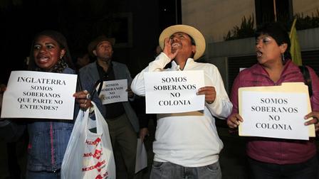 En los mismos términos se pronunció un grupo de unos cuarenta manifestantes afines al gobierno ecuatoriano que se apostó frente a la embajada de Reino Unido en Quito para rechazar la posición británica.