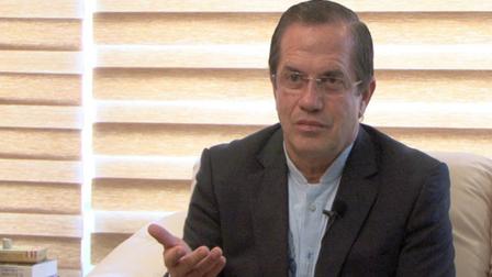 La entrevista se desarrolló en una sala contigua al despacho del canciller en Quito, en la que figura una foto de Patiño con los presidentes Rafael Correa de Ecuador y Hugo Chávez de Venezuela, así como con el líder cubano Fidel Castro.