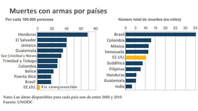 Según datos de Naciones Unidas, Estados Unidos es el quinto país en el mundo en cuanto al número de personas que mueren por arma de fuego, con 9.960 homicidios de este tipo en 2010.