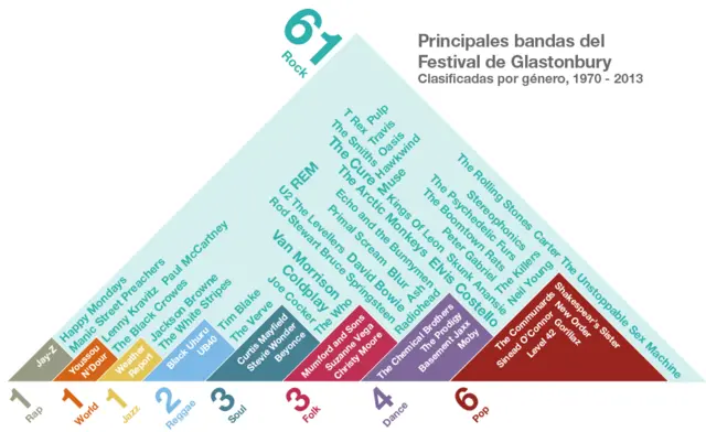 82 bandas de renombre han tocado en el escenario principal, que adoptó su particular forma de pirámide en el segundo festival, en 1971. Van Morrison, Elvis Costello, The Cure y Coldplay comparten el récord por haber aparecido como bandas principales (tres veces). Seis bandas que iban a actuar en el escenario de la pirámide cancelaron su participación: The Kinks (1970), Red Hot Chili Peppers (1993), The Stone Roses (1995), Stevie Winwood (1997), Kylie Minogue (2005) y U2 (2010).