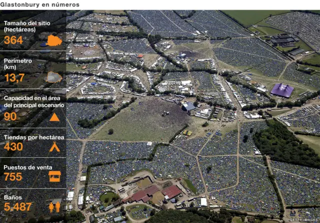 Con temperaturas que no superan los 18º y un cielo cubierto de nubes arranca este viernes el Festival de Glastonbury, en el sudoeste de Inglaterra. BBC Mundo le ofrece un panorama en números de la mayor fiesta musical al aire libre del mundo.