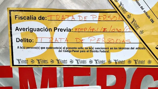 Una mugrienta alfombra verde cubre la acera. Las puertas metálicas tienen los sellos amarillos de clausura, algunos desgarrados. En uno de ellos, intacto, dice "Delito: trata de personas".