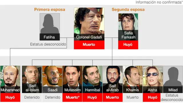 De los ochos hijos biológicos del Coronel Gadafi sólo dos se encuentran en territorio libio: Saadi y Seif al Islam, quien permanece en la localidad de Zintan, en manos de una milicia que se niega a entregarlo, y quien es requerido por la Corte Penal Internacional.
