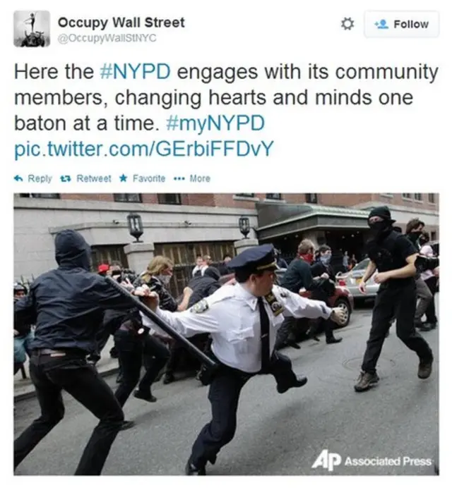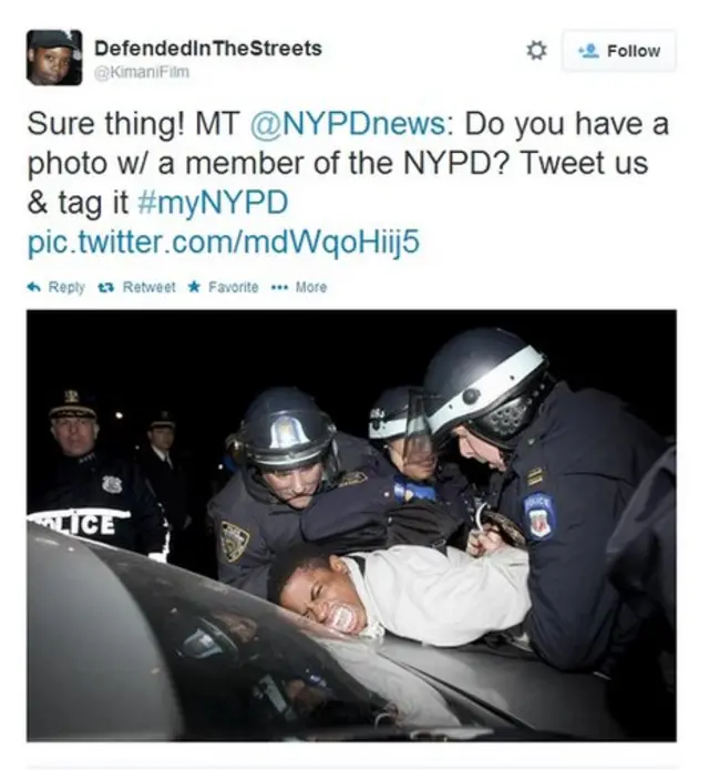 Pero aunque varias personas lo hicieron, el hashtag también fue recogido por otros que lo utilizaron para identificar tuits que contuvieran fotos de la policía de Nueva York en situaciones más hostiles.