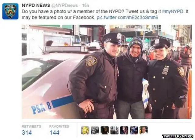 La institución les pidió a los ciudadanos que se sacaran fotos con policías de la ciudad y las subieran a Twitter con la etiqueta (hashtag) #myNYPD como parte de su campaña en redes sociales.