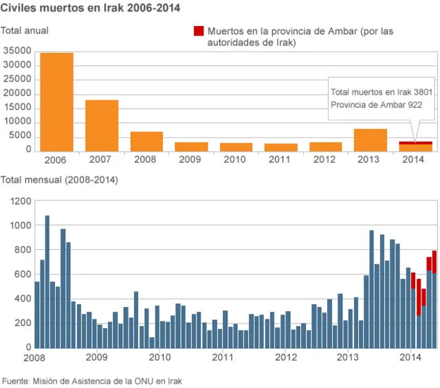 Las matanzas sectarias aumentaron hasta que alcanzar su nivel máximo en 2006. Pero los hechos actuales empezaron en diciembre de 2013, cuando militantes islamistas tomaron la ciudad de Faluya, en el centro del país, además de algunas poblaciones cercanas a Ramadi.
